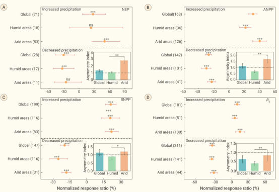 研究还发现土壤含水量是导致生态系统碳汇对降水改变非对称响应的关键因素。在干旱地区,在降水增加处理下,土壤含水量增加了30.86%,而在降水减少处理下,土壤含水量减少了-20.21%,土壤含水量对降水改变表现为正的非对称性响应。这与上文提到的生态系统碳汇的响应模式一致(图1A)。但干旱区和湿润区生态系统碳汇非对称响应的调控机制不同(图2)。在干旱地区,生态系统碳汇的正非对称响应主要来自植被生产力的正非对称性响应(图2A);而湿润地区生态系统碳汇的正非对称性主要来自于土壤呼吸过程中负非对称性响应,即降水处理下土壤呼吸减少量高于降水增加处理的增加量(图2B)。
