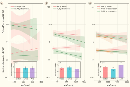 全球变暖改变了全球降水模式并导致降水变异增加,这种趋势预计在未来几十年将持续。在未来降水变异增加的背景下,全球陆地生态系统碳汇是否会发生改变仍不清楚。基于此,本研究通过整合分析,同时结合TRENDY模型和遥感数据,量化了陆地生态系统碳汇对降水变异的响应。研究发现在相同降水变化情况下,生态系统碳汇对降水改变呈现正的非对称性响应,即降水增加处理下生态系统碳汇的增加幅度(33.4%)大于降水减少处理下生态系统碳汇的减少幅度(-24.62%),且在干旱地区(年降水< 500 mm)的正非对称性响应大于湿润地区(年降水> 500 mm)(图1)。