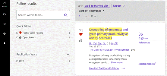 胡中民教授在地球科学领域顶级期刊 Remote Sensing of Envir-onment 发表题为 “Decoupling of greenness and gross primary productivity as aridity decreases” 的论文(//webofscience.clarivate.cn/wos/alldb/full-record/WOS:000841460500001) 入选ESI高被引文章。ESI高被引论文 (Highly Cited Pa-pers) 是指近10年内发表且被引次数排在相应学科领域全球前1%以内的论文。该论文的第一和通讯作者为胡中民教授。