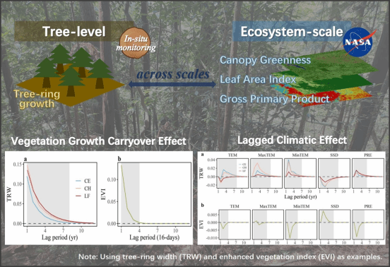 当前的植被生长不仅受气候变化的影响(即气候滞后效应),还受到前期生长变化速率的影响(即生长延续效应)。然而,目前对生物和全球变化的时滞效应理解不足,阻碍跨尺度生物地球化学模型预测精度提升。另外,以往研究主要集中在单个树种或生态系统水平,很少同时考虑尺度效应。刘曙光教授团队结合野外调查和遥感技术,利用实测所得的甜槠、锥栗和枫香树轮宽度数据,以及遥感观测的增强植被指数、叶面积指数和总初级生产力数据,探讨了生长延续效应(VGC)和气候滞后效应(LCE)在树种和生态系统尺度对植被生长的影响。研究假设VGC在两个尺度上都主导了植被生长的响应,VGC和LCE之间以及树种尺度的径向生长和生态系统尺度的光合能力之间存在解耦。为了验证研究假设,本研究采用向量自回归模型和脉冲响应函数,模拟和比较了不同时空尺度VGC和LCE对树木年轮生长、冠层动态、叶片生长和整体生态系统功能的影响。