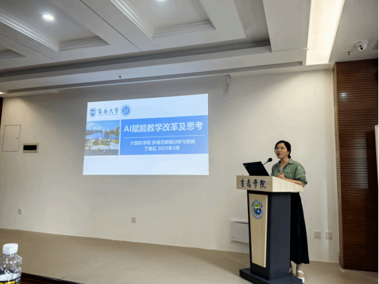 全体教职工齐聚一堂,共同探讨AI在教学领域的应用与发展前景。主讲人为计算机科学与技术学院丁继红教授。