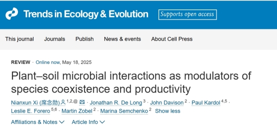 席念勋以第一作者兼独立通讯作者在Trends in Ecology & Evolution发表了题为“Plant-soil microbial interactions as modulators of species coexistence and productivity”的综述文章,从理论上阐明土壤微生物调节植物物种共存及多样性影响生产力的理论基础,然后据此解释不同微生物类群(专化微生物,泛化微生物)如何调节物种间的生态位和适合度差异,进而通过互补效应和选择效应影响生产力,并据此推断两类机制之间的关联。研究认为不同的土壤微生物类群对植物物种共存和多样性-生产力关系可能有截然不同的影响,具体取决于植物-土壤微生物互作的类型和专化性。此外,与植物产生对抗性关系或者互利性关系的其他类群(比如叶际微生物、传粉者、食草昆虫等)也可能通过类似的机制调节植物物种共存和生态系统功能。塔尔图大学的Marina Semchenko教授、Martin Zobel教授以及瑞典农业大学Paul Kardol教授等为本文的共同作者。