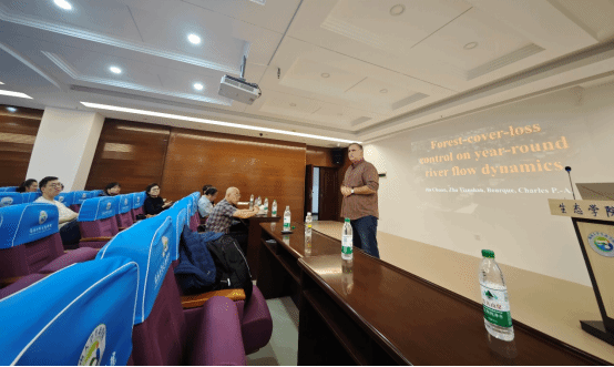 Charles Bourque教授以《Forest-cover-loss control on year-round river flow dynamics》为题,讲述了北美东北部圣约翰河盆地上游森林流失对全年水流量动态的影响。讲座期间,Bourque教授深入剖析了森林流失对水循环的影响,吸引了在场师生的广泛关注与深思。互动环节中,大家积极发言,提出了诸多问题和见解。