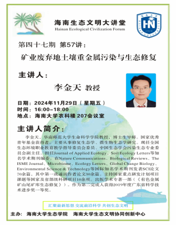 2024年11月29日下午,海南生态文明大讲堂第四十七期第57讲在农科楼207会议室成功举办。本次讲座由华南师范大学生命科学学院李金天教授主讲,小宝影院